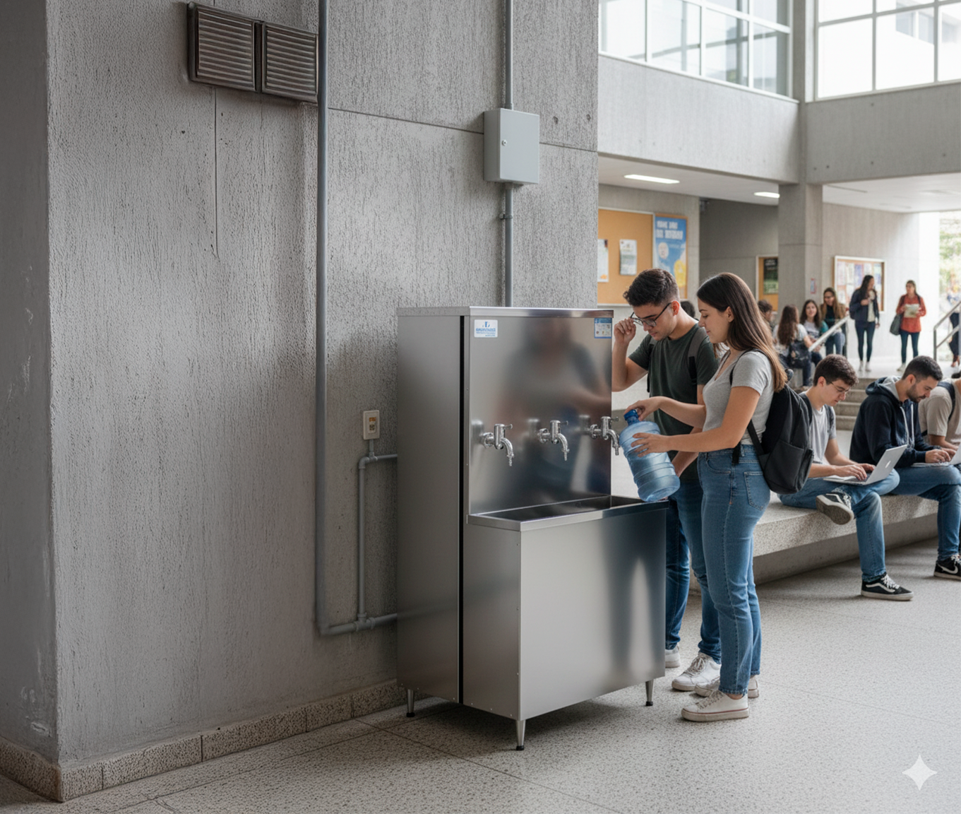 Bebedouros industriais em aço inox, certificados pelo INMETRO e prontos para alto fluxo. Fale com um especialista e receba orçamento, configuração e instalação em poucos passos.